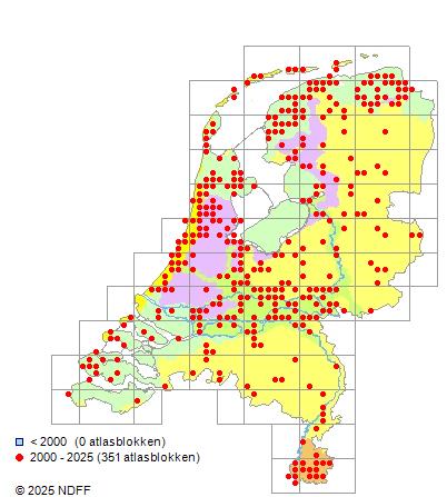 Het aantal atlasblokken (5x5 km) waarin de soort is gemeld binnen een periode van vijf jaar (vanaf 1980) of twintig jaar. Niet gecorrigeerd voor waarnemersinspanning en het aantal doorgegeven waarnemingen kan sterk variëren per periode, dus een trend in verspreiding kan hier niet direct uit worden afgelezen. Het opgegeven jaartal is het eerste jaar van de periode. Bron: gevalideerde waarnemingen uit de NDFF.