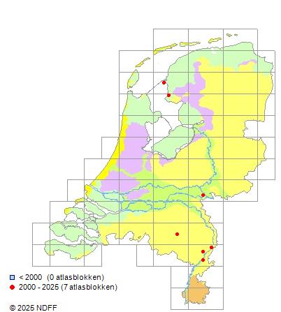 Het aantal atlasblokken (5x5 km) waarin de soort is gemeld binnen een periode van vijf jaar (vanaf 1980) of twintig jaar. Niet gecorrigeerd voor waarnemersinspanning en het aantal doorgegeven waarnemingen kan sterk variëren per periode, dus een trend in verspreiding kan hier niet direct uit worden afgelezen. Het opgegeven jaartal is het eerste jaar van de periode. Bron: gevalideerde waarnemingen uit de NDFF.
