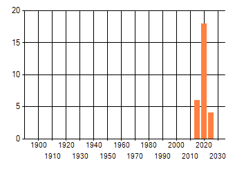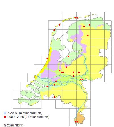 Het aantal atlasblokken (5x5 km) waarin de soort is gemeld binnen een periode van vijf jaar (vanaf 1980) of twintig jaar. Niet gecorrigeerd voor waarnemersinspanning en het aantal doorgegeven waarnemingen kan sterk variëren per periode, dus een trend in verspreiding kan hier niet direct uit worden afgelezen. Het opgegeven jaartal is het eerste jaar van de periode. Bron: gevalideerde waarnemingen uit de NDFF.