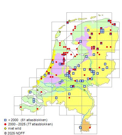 Het aantal atlasblokken (5x5 km) waarin de soort is gemeld binnen een periode van vijf jaar (vanaf 1980) of twintig jaar. Niet gecorrigeerd voor waarnemersinspanning en het aantal doorgegeven waarnemingen kan sterk variëren per periode, dus een trend in verspreiding kan hier niet direct uit worden afgelezen. Het opgegeven jaartal is het eerste jaar van de periode. Bron: gevalideerde waarnemingen uit de NDFF.