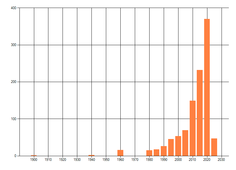 Het aantal atlasblokken (5x5 km) waarin de soort is gemeld binnen een periode van vijf jaar (vanaf 1980) of twintig jaar. Niet gecorrigeerd voor waarnemersinspanning en het aantal doorgegeven waarnemingen kan sterk variëren per periode, dus een trend in verspreiding kan hier niet direct uit worden afgelezen. Het opgegeven jaartal is het eerste jaar van de periode. Bron: gevalideerde waarnemingen uit de NDFF.