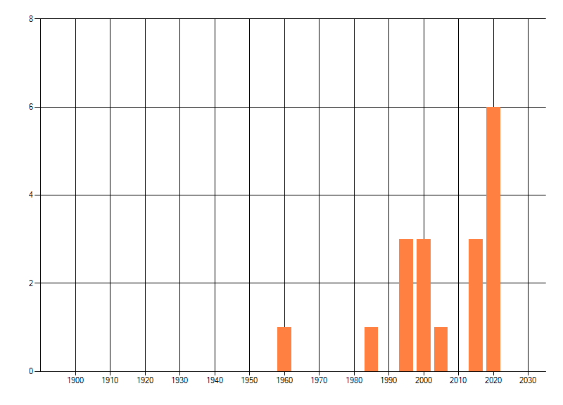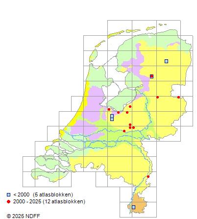 Het aantal atlasblokken (5x5 km) waarin de soort is gemeld binnen een periode van vijf jaar (vanaf 1980) of twintig jaar. Niet gecorrigeerd voor waarnemersinspanning en het aantal doorgegeven waarnemingen kan sterk variëren per periode, dus een trend in verspreiding kan hier niet direct uit worden afgelezen. Het opgegeven jaartal is het eerste jaar van de periode. Bron: gevalideerde waarnemingen uit de NDFF.