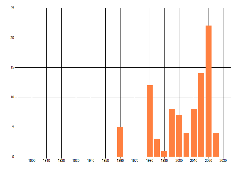 Het aantal atlasblokken (5x5 km) waarin de soort is gemeld binnen een periode van vijf jaar (vanaf 1980) of twintig jaar. Niet gecorrigeerd voor waarnemersinspanning en het aantal doorgegeven waarnemingen kan sterk variëren per periode, dus een trend in verspreiding kan hier niet direct uit worden afgelezen. Het opgegeven jaartal is het eerste jaar van de periode. Bron: gevalideerde waarnemingen uit de NDFF.