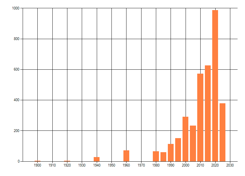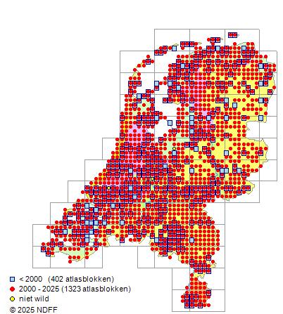 Het aantal atlasblokken (5x5 km) waarin de soort is gemeld binnen een periode van vijf jaar (vanaf 1980) of twintig jaar. Niet gecorrigeerd voor waarnemersinspanning en het aantal doorgegeven waarnemingen kan sterk variëren per periode, dus een trend in verspreiding kan hier niet direct uit worden afgelezen. Het opgegeven jaartal is het eerste jaar van de periode. Bron: gevalideerde waarnemingen uit de NDFF.