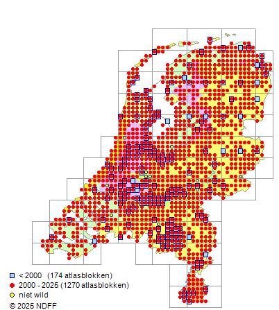 Het aantal atlasblokken (5x5 km) waarin de soort is gemeld binnen een periode van vijf jaar (vanaf 1980) of twintig jaar. Niet gecorrigeerd voor waarnemersinspanning en het aantal doorgegeven waarnemingen kan sterk variëren per periode, dus een trend in verspreiding kan hier niet direct uit worden afgelezen. Het opgegeven jaartal is het eerste jaar van de periode. Bron: gevalideerde waarnemingen uit de NDFF.