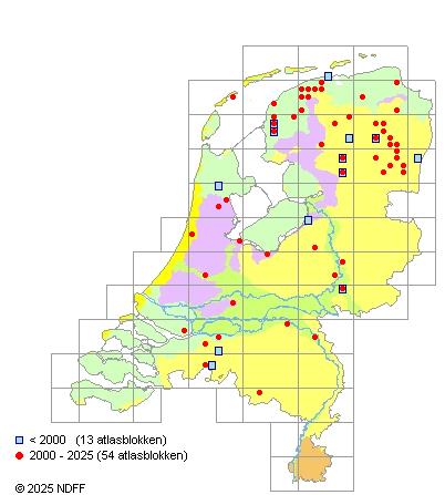 Het aantal atlasblokken (5x5 km) waarin de soort is gemeld binnen een periode van vijf jaar (vanaf 1980) of twintig jaar. Niet gecorrigeerd voor waarnemersinspanning en het aantal doorgegeven waarnemingen kan sterk variëren per periode, dus een trend in verspreiding kan hier niet direct uit worden afgelezen. Het opgegeven jaartal is het eerste jaar van de periode. Bron: gevalideerde waarnemingen uit de NDFF.