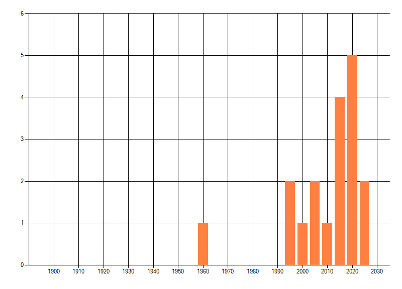 Het aantal atlasblokken (5x5 km) waarin de soort is gemeld binnen een periode van vijf jaar (vanaf 1980) of twintig jaar. Niet gecorrigeerd voor waarnemersinspanning en het aantal doorgegeven waarnemingen kan sterk variëren per periode, dus een trend in verspreiding kan hier niet direct uit worden afgelezen. Het opgegeven jaartal is het eerste jaar van de periode. Bron: gevalideerde waarnemingen uit de NDFF.