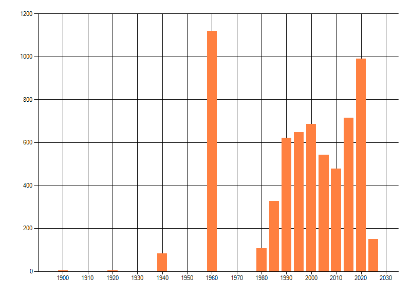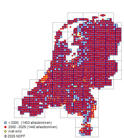 Het aantal atlasblokken (5x5 km) waarin de soort is gemeld binnen een periode van vijf jaar (vanaf 1980) of twintig jaar. Niet gecorrigeerd voor waarnemersinspanning en het aantal doorgegeven waarnemingen kan sterk variëren per periode, dus een trend in verspreiding kan hier niet direct uit worden afgelezen. Het opgegeven jaartal is het eerste jaar van de periode. Bron: gevalideerde waarnemingen uit de NDFF.