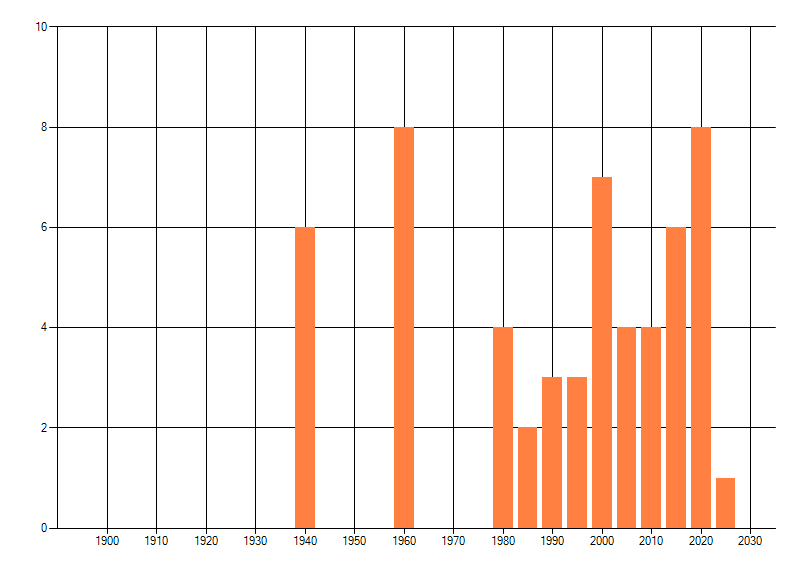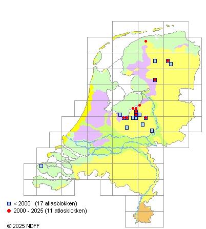 Het aantal atlasblokken (5x5 km) waarin de soort is gemeld binnen een periode van vijf jaar (vanaf 1980) of twintig jaar. Niet gecorrigeerd voor waarnemersinspanning en het aantal doorgegeven waarnemingen kan sterk variëren per periode, dus een trend in verspreiding kan hier niet direct uit worden afgelezen. Het opgegeven jaartal is het eerste jaar van de periode. Bron: gevalideerde waarnemingen uit de NDFF.
