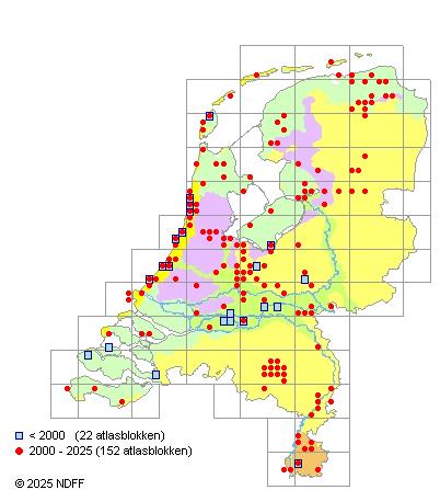 Het aantal atlasblokken (5x5 km) waarin de soort is gemeld binnen een periode van vijf jaar (vanaf 1980) of twintig jaar. Niet gecorrigeerd voor waarnemersinspanning en het aantal doorgegeven waarnemingen kan sterk variƫren per periode, dus een trend in verspreiding kan hier niet direct uit worden afgelezen. Het opgegeven jaartal is het eerste jaar van de periode. Bron: gevalideerde waarnemingen uit de NDFF.