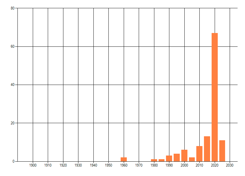 Het aantal atlasblokken (5x5 km) waarin de soort is gemeld binnen een periode van vijf jaar (vanaf 1980) of twintig jaar. Niet gecorrigeerd voor waarnemersinspanning en het aantal doorgegeven waarnemingen kan sterk variƫren per periode, dus een trend in verspreiding kan hier niet direct uit worden afgelezen. Het opgegeven jaartal is het eerste jaar van de periode. Bron: gevalideerde waarnemingen uit de NDFF.