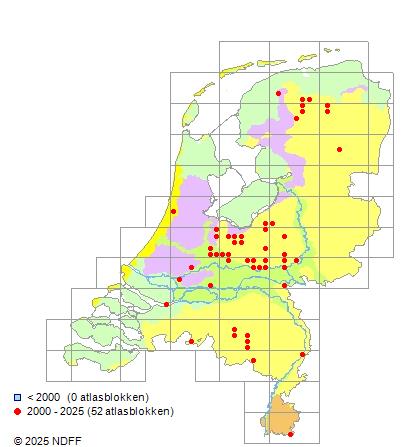 Het aantal atlasblokken (5x5 km) waarin de soort is gemeld binnen een periode van vijf jaar (vanaf 1980) of twintig jaar. Niet gecorrigeerd voor waarnemersinspanning en het aantal doorgegeven waarnemingen kan sterk variëren per periode, dus een trend in verspreiding kan hier niet direct uit worden afgelezen. Het opgegeven jaartal is het eerste jaar van de periode. Bron: gevalideerde waarnemingen uit de NDFF.