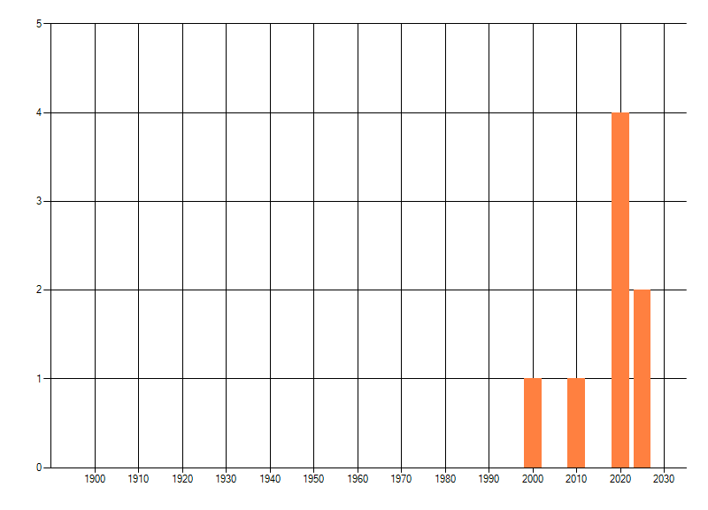 Het aantal atlasblokken (5x5 km) waarin de soort is gemeld binnen een periode van vijf jaar (vanaf 1980) of twintig jaar. Niet gecorrigeerd voor waarnemersinspanning en het aantal doorgegeven waarnemingen kan sterk variëren per periode, dus een trend in verspreiding kan hier niet direct uit worden afgelezen. Het opgegeven jaartal is het eerste jaar van de periode. Bron: gevalideerde waarnemingen uit de NDFF.