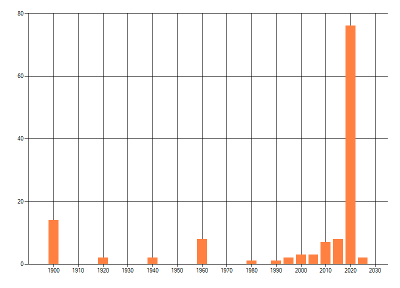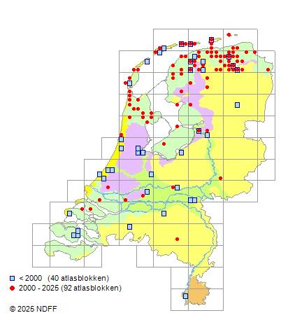 Het aantal atlasblokken (5x5 km) waarin de soort is gemeld binnen een periode van vijf jaar (vanaf 1980) of twintig jaar. Niet gecorrigeerd voor waarnemersinspanning en het aantal doorgegeven waarnemingen kan sterk variëren per periode, dus een trend in verspreiding kan hier niet direct uit worden afgelezen. Het opgegeven jaartal is het eerste jaar van de periode. Bron: gevalideerde waarnemingen uit de NDFF.