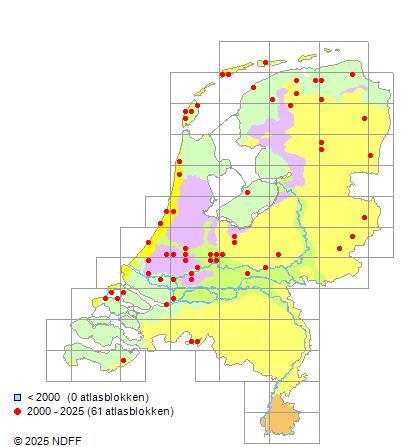 Het aantal atlasblokken (5x5 km) waarin de soort is gemeld binnen een periode van vijf jaar (vanaf 1980) of twintig jaar. Niet gecorrigeerd voor waarnemersinspanning en het aantal doorgegeven waarnemingen kan sterk variëren per periode, dus een trend in verspreiding kan hier niet direct uit worden afgelezen. Het opgegeven jaartal is het eerste jaar van de periode. Bron: gevalideerde waarnemingen uit de NDFF.