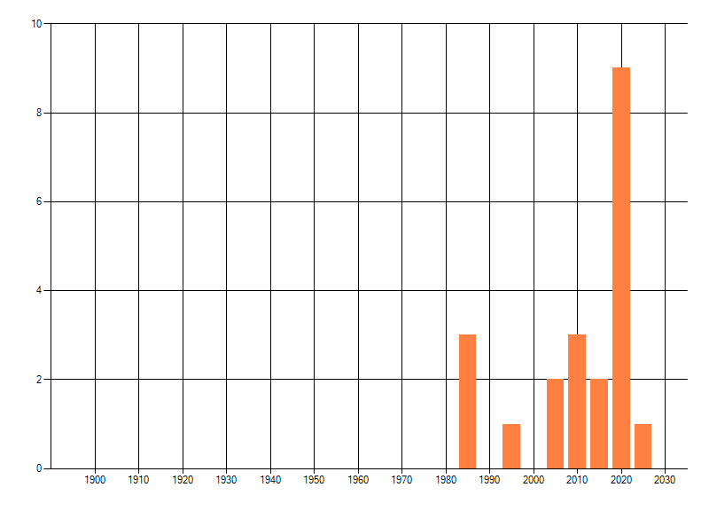 Het aantal atlasblokken (5x5 km) waarin de soort is gemeld binnen een periode van vijf jaar (vanaf 1980) of twintig jaar. Niet gecorrigeerd voor waarnemersinspanning en het aantal doorgegeven waarnemingen kan sterk variëren per periode, dus een trend in verspreiding kan hier niet direct uit worden afgelezen. Het opgegeven jaartal is het eerste jaar van de periode. Bron: gevalideerde waarnemingen uit de NDFF.