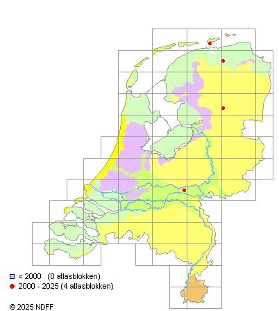 Het aantal atlasblokken (5x5 km) waarin de soort is gemeld binnen een periode van vijf jaar (vanaf 1980) of twintig jaar. Niet gecorrigeerd voor waarnemersinspanning en het aantal doorgegeven waarnemingen kan sterk variëren per periode, dus een trend in verspreiding kan hier niet direct uit worden afgelezen. Het opgegeven jaartal is het eerste jaar van de periode. Bron: gevalideerde waarnemingen uit de NDFF.