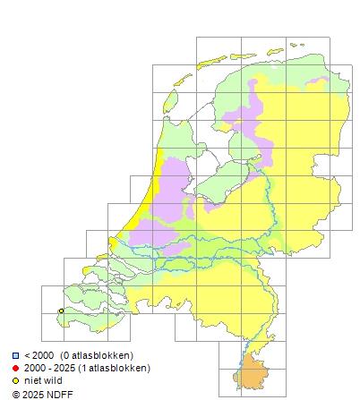 Het aantal atlasblokken (5x5 km) waarin de soort is gemeld binnen een periode van vijf jaar (vanaf 1980) of twintig jaar. Niet gecorrigeerd voor waarnemersinspanning en het aantal doorgegeven waarnemingen kan sterk variëren per periode, dus een trend in verspreiding kan hier niet direct uit worden afgelezen. Het opgegeven jaartal is het eerste jaar van de periode. Bron: gevalideerde waarnemingen uit de NDFF.