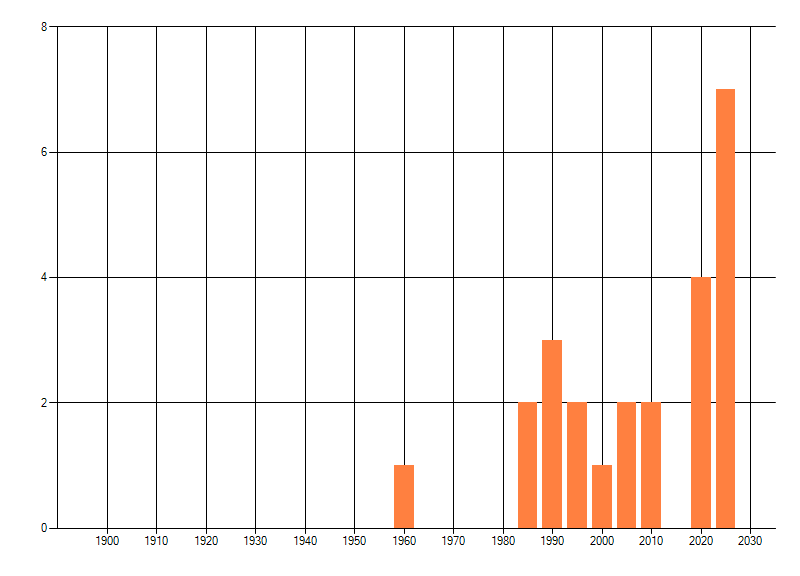 Het aantal atlasblokken (5x5 km) waarin de soort is gemeld binnen een periode van vijf jaar (vanaf 1980) of twintig jaar. Niet gecorrigeerd voor waarnemersinspanning en het aantal doorgegeven waarnemingen kan sterk variëren per periode, dus een trend in verspreiding kan hier niet direct uit worden afgelezen. Het opgegeven jaartal is het eerste jaar van de periode. Bron: gevalideerde waarnemingen uit de NDFF.