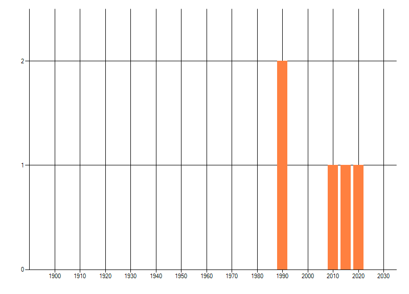 Het aantal atlasblokken (5x5 km) waarin de soort is gemeld binnen een periode van vijf jaar (vanaf 1980) of twintig jaar. Niet gecorrigeerd voor waarnemersinspanning en het aantal doorgegeven waarnemingen kan sterk variëren per periode, dus een trend in verspreiding kan hier niet direct uit worden afgelezen. Het opgegeven jaartal is het eerste jaar van de periode. Bron: gevalideerde waarnemingen uit de NDFF.
