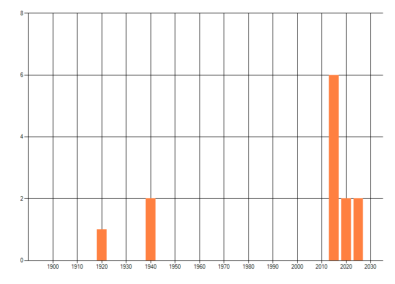 Het aantal atlasblokken (5x5 km) waarin de soort is gemeld binnen een periode van vijf jaar (vanaf 1980) of twintig jaar. Niet gecorrigeerd voor waarnemersinspanning en het aantal doorgegeven waarnemingen kan sterk variëren per periode, dus een trend in verspreiding kan hier niet direct uit worden afgelezen. Het opgegeven jaartal is het eerste jaar van de periode. Bron: gevalideerde waarnemingen uit de NDFF.