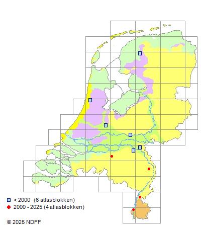 Het aantal atlasblokken (5x5 km) waarin de soort is gemeld binnen een periode van vijf jaar (vanaf 1980) of twintig jaar. Niet gecorrigeerd voor waarnemersinspanning en het aantal doorgegeven waarnemingen kan sterk variëren per periode, dus een trend in verspreiding kan hier niet direct uit worden afgelezen. Het opgegeven jaartal is het eerste jaar van de periode. Bron: gevalideerde waarnemingen uit de NDFF.