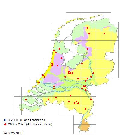 Het aantal atlasblokken (5x5 km) waarin de soort is gemeld binnen een periode van vijf jaar (vanaf 1980) of twintig jaar. Niet gecorrigeerd voor waarnemersinspanning en het aantal doorgegeven waarnemingen kan sterk variëren per periode, dus een trend in verspreiding kan hier niet direct uit worden afgelezen. Het opgegeven jaartal is het eerste jaar van de periode. Bron: gevalideerde waarnemingen uit de NDFF.