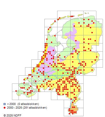 Het aantal atlasblokken (5x5 km) waarin de soort is gemeld binnen een periode van vijf jaar (vanaf 1980) of twintig jaar. Niet gecorrigeerd voor waarnemersinspanning en het aantal doorgegeven waarnemingen kan sterk variëren per periode, dus een trend in verspreiding kan hier niet direct uit worden afgelezen. Het opgegeven jaartal is het eerste jaar van de periode. Bron: gevalideerde waarnemingen uit de NDFF.