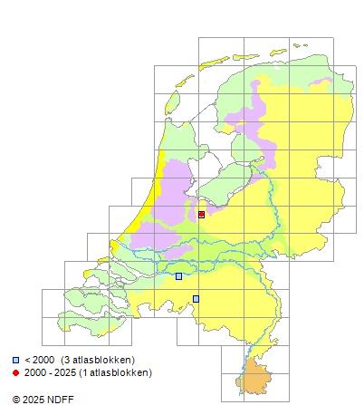 Het aantal atlasblokken (5x5 km) waarin de soort is gemeld binnen een periode van vijf jaar (vanaf 1980) of twintig jaar. Niet gecorrigeerd voor waarnemersinspanning en het aantal doorgegeven waarnemingen kan sterk variëren per periode, dus een trend in verspreiding kan hier niet direct uit worden afgelezen. Het opgegeven jaartal is het eerste jaar van de periode. Bron: gevalideerde waarnemingen uit de NDFF.