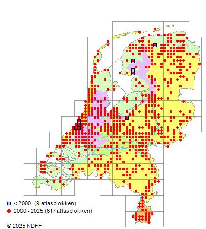 Het aantal atlasblokken (5x5 km) waarin de soort is gemeld binnen een periode van vijf jaar (vanaf 1980) of twintig jaar. Niet gecorrigeerd voor waarnemersinspanning en het aantal doorgegeven waarnemingen kan sterk variëren per periode, dus een trend in verspreiding kan hier niet direct uit worden afgelezen. Het opgegeven jaartal is het eerste jaar van de periode. Bron: gevalideerde waarnemingen uit de NDFF.