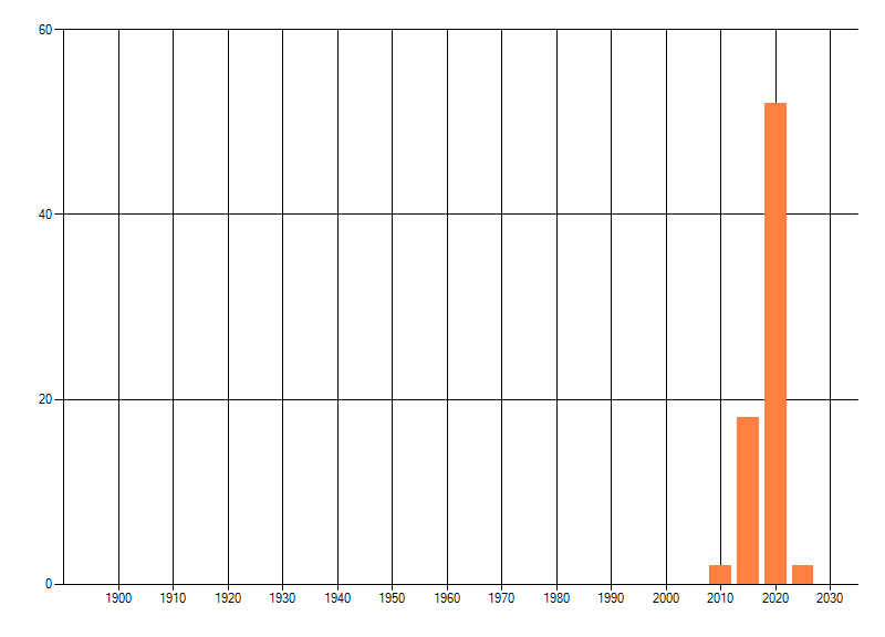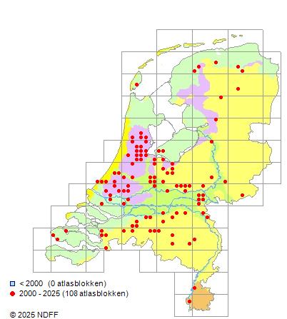 Het aantal atlasblokken (5x5 km) waarin de soort is gemeld binnen een periode van vijf jaar (vanaf 1980) of twintig jaar. Niet gecorrigeerd voor waarnemersinspanning en het aantal doorgegeven waarnemingen kan sterk variëren per periode, dus een trend in verspreiding kan hier niet direct uit worden afgelezen. Het opgegeven jaartal is het eerste jaar van de periode. Bron: gevalideerde waarnemingen uit de NDFF.