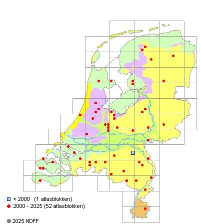 Het aantal atlasblokken (5x5 km) waarin de soort is gemeld binnen een periode van vijf jaar (vanaf 1980) of twintig jaar. Niet gecorrigeerd voor waarnemersinspanning en het aantal doorgegeven waarnemingen kan sterk variëren per periode, dus een trend in verspreiding kan hier niet direct uit worden afgelezen. Het opgegeven jaartal is het eerste jaar van de periode. Bron: gevalideerde waarnemingen uit de NDFF.