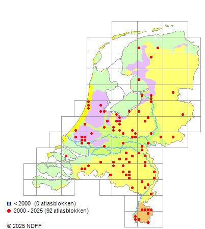 Het aantal atlasblokken (5x5 km) waarin de soort is gemeld binnen een periode van vijf jaar (vanaf 1980) of twintig jaar. Niet gecorrigeerd voor waarnemersinspanning en het aantal doorgegeven waarnemingen kan sterk variëren per periode, dus een trend in verspreiding kan hier niet direct uit worden afgelezen. Het opgegeven jaartal is het eerste jaar van de periode. Bron: gevalideerde waarnemingen uit de NDFF.