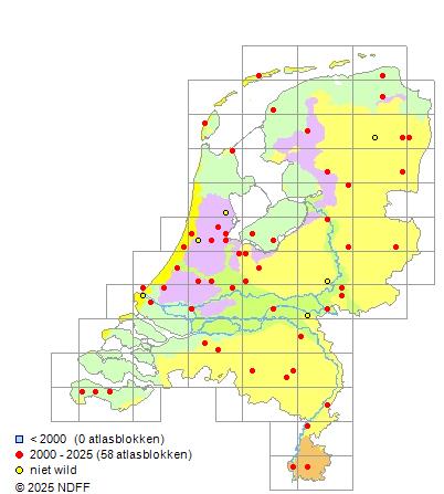 Het aantal atlasblokken (5x5 km) waarin de soort is gemeld binnen een periode van vijf jaar (vanaf 1980) of twintig jaar. Niet gecorrigeerd voor waarnemersinspanning en het aantal doorgegeven waarnemingen kan sterk variëren per periode, dus een trend in verspreiding kan hier niet direct uit worden afgelezen. Het opgegeven jaartal is het eerste jaar van de periode. Bron: gevalideerde waarnemingen uit de NDFF.