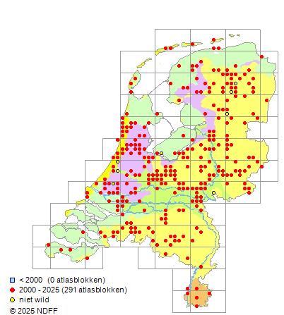 Het aantal atlasblokken (5x5 km) waarin de soort is gemeld binnen een periode van vijf jaar (vanaf 1980) of twintig jaar. Niet gecorrigeerd voor waarnemersinspanning en het aantal doorgegeven waarnemingen kan sterk variëren per periode, dus een trend in verspreiding kan hier niet direct uit worden afgelezen. Het opgegeven jaartal is het eerste jaar van de periode. Bron: gevalideerde waarnemingen uit de NDFF.