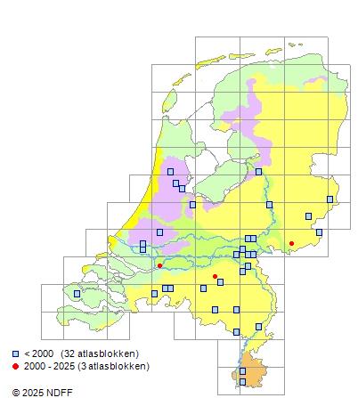 Het aantal atlasblokken (5x5 km) waarin de soort is gemeld binnen een periode van vijf jaar (vanaf 1980) of twintig jaar. Niet gecorrigeerd voor waarnemersinspanning en het aantal doorgegeven waarnemingen kan sterk variëren per periode, dus een trend in verspreiding kan hier niet direct uit worden afgelezen. Het opgegeven jaartal is het eerste jaar van de periode. Bron: gevalideerde waarnemingen uit de NDFF.
