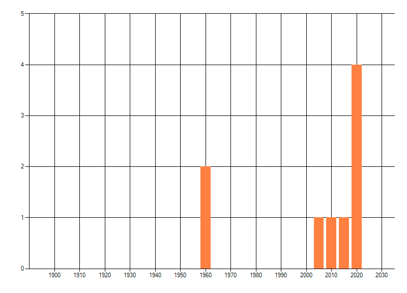 Het aantal atlasblokken (5x5 km) waarin de soort is gemeld binnen een periode van vijf jaar (vanaf 1980) of twintig jaar. Niet gecorrigeerd voor waarnemersinspanning en het aantal doorgegeven waarnemingen kan sterk variëren per periode, dus een trend in verspreiding kan hier niet direct uit worden afgelezen. Het opgegeven jaartal is het eerste jaar van de periode. Bron: gevalideerde waarnemingen uit de NDFF.