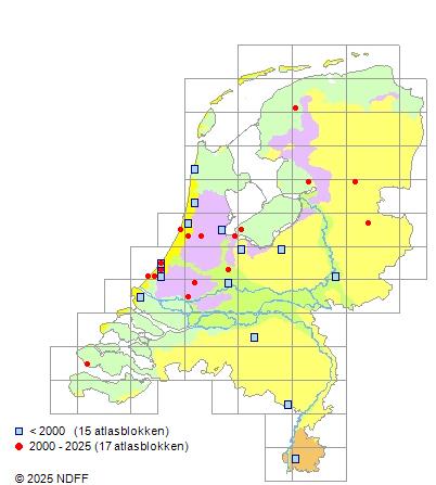 Het aantal atlasblokken (5x5 km) waarin de soort is gemeld binnen een periode van vijf jaar (vanaf 1980) of twintig jaar. Niet gecorrigeerd voor waarnemersinspanning en het aantal doorgegeven waarnemingen kan sterk variëren per periode, dus een trend in verspreiding kan hier niet direct uit worden afgelezen. Het opgegeven jaartal is het eerste jaar van de periode. Bron: gevalideerde waarnemingen uit de NDFF.