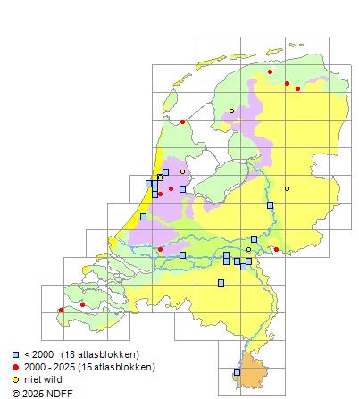 Het aantal atlasblokken (5x5 km) waarin de soort is gemeld binnen een periode van vijf jaar (vanaf 1980) of twintig jaar. Niet gecorrigeerd voor waarnemersinspanning en het aantal doorgegeven waarnemingen kan sterk variëren per periode, dus een trend in verspreiding kan hier niet direct uit worden afgelezen. Het opgegeven jaartal is het eerste jaar van de periode. Bron: gevalideerde waarnemingen uit de NDFF.