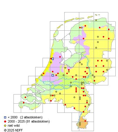 Het aantal atlasblokken (5x5 km) waarin de soort is gemeld binnen een periode van vijf jaar (vanaf 1980) of twintig jaar. Niet gecorrigeerd voor waarnemersinspanning en het aantal doorgegeven waarnemingen kan sterk variëren per periode, dus een trend in verspreiding kan hier niet direct uit worden afgelezen. Het opgegeven jaartal is het eerste jaar van de periode. Bron: gevalideerde waarnemingen uit de NDFF.