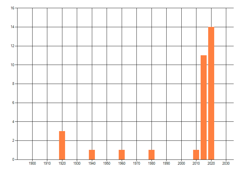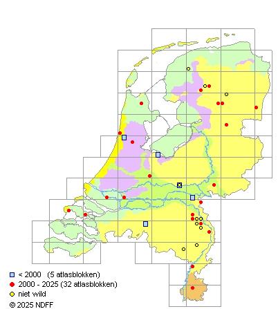 Het aantal atlasblokken (5x5 km) waarin de soort is gemeld binnen een periode van vijf jaar (vanaf 1980) of twintig jaar. Niet gecorrigeerd voor waarnemersinspanning en het aantal doorgegeven waarnemingen kan sterk variëren per periode, dus een trend in verspreiding kan hier niet direct uit worden afgelezen. Het opgegeven jaartal is het eerste jaar van de periode. Bron: gevalideerde waarnemingen uit de NDFF.