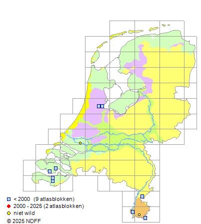 Het aantal atlasblokken (5x5 km) waarin de soort is gemeld binnen een periode van vijf jaar (vanaf 1980) of twintig jaar. Niet gecorrigeerd voor waarnemersinspanning en het aantal doorgegeven waarnemingen kan sterk variëren per periode, dus een trend in verspreiding kan hier niet direct uit worden afgelezen. Het opgegeven jaartal is het eerste jaar van de periode. Bron: gevalideerde waarnemingen uit de NDFF.