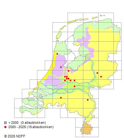 Het aantal atlasblokken (5x5 km) waarin de soort is gemeld binnen een periode van vijf jaar (vanaf 1980) of twintig jaar. Niet gecorrigeerd voor waarnemersinspanning en het aantal doorgegeven waarnemingen kan sterk variëren per periode, dus een trend in verspreiding kan hier niet direct uit worden afgelezen. Het opgegeven jaartal is het eerste jaar van de periode. Bron: gevalideerde waarnemingen uit de NDFF.