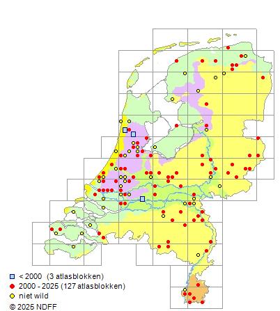 Het aantal atlasblokken (5x5 km) waarin de soort is gemeld binnen een periode van vijf jaar (vanaf 1980) of twintig jaar. Niet gecorrigeerd voor waarnemersinspanning en het aantal doorgegeven waarnemingen kan sterk variëren per periode, dus een trend in verspreiding kan hier niet direct uit worden afgelezen. Het opgegeven jaartal is het eerste jaar van de periode. Bron: gevalideerde waarnemingen uit de NDFF.