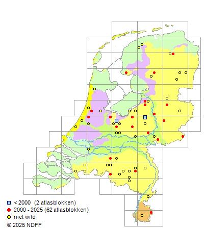 Het aantal atlasblokken (5x5 km) waarin de soort is gemeld binnen een periode van vijf jaar (vanaf 1980) of twintig jaar. Niet gecorrigeerd voor waarnemersinspanning en het aantal doorgegeven waarnemingen kan sterk variëren per periode, dus een trend in verspreiding kan hier niet direct uit worden afgelezen. Het opgegeven jaartal is het eerste jaar van de periode. Bron: gevalideerde waarnemingen uit de NDFF.