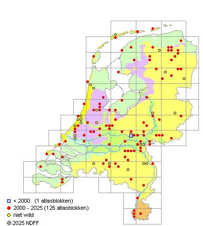 Het aantal atlasblokken (5x5 km) waarin de soort is gemeld binnen een periode van vijf jaar (vanaf 1980) of twintig jaar. Niet gecorrigeerd voor waarnemersinspanning en het aantal doorgegeven waarnemingen kan sterk variëren per periode, dus een trend in verspreiding kan hier niet direct uit worden afgelezen. Het opgegeven jaartal is het eerste jaar van de periode. Bron: gevalideerde waarnemingen uit de NDFF.