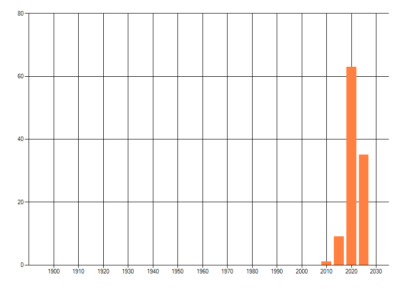 Het aantal atlasblokken (5x5 km) waarin de soort is gemeld binnen een periode van vijf jaar (vanaf 1980) of twintig jaar. Niet gecorrigeerd voor waarnemersinspanning en het aantal doorgegeven waarnemingen kan sterk variëren per periode, dus een trend in verspreiding kan hier niet direct uit worden afgelezen. Het opgegeven jaartal is het eerste jaar van de periode. Bron: gevalideerde waarnemingen uit de NDFF.