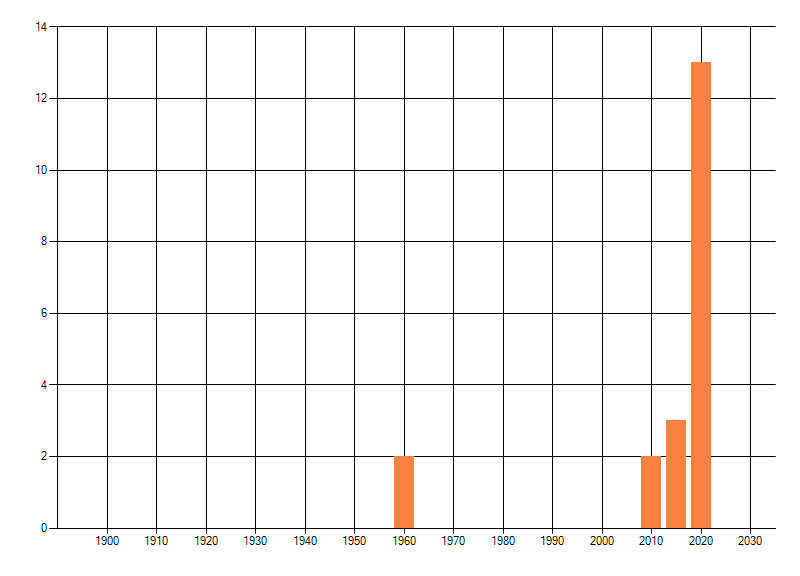Het aantal atlasblokken (5x5 km) waarin de soort is gemeld binnen een periode van vijf jaar (vanaf 1980) of twintig jaar. Niet gecorrigeerd voor waarnemersinspanning en het aantal doorgegeven waarnemingen kan sterk variëren per periode, dus een trend in verspreiding kan hier niet direct uit worden afgelezen. Het opgegeven jaartal is het eerste jaar van de periode. Bron: gevalideerde waarnemingen uit de NDFF.