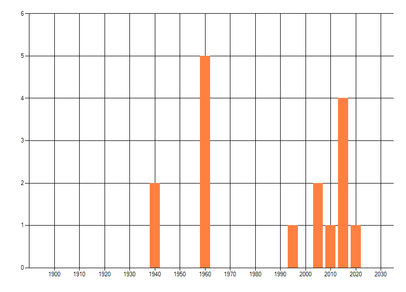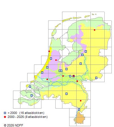 Het aantal atlasblokken (5x5 km) waarin de soort is gemeld binnen een periode van vijf jaar (vanaf 1980) of twintig jaar. Niet gecorrigeerd voor waarnemersinspanning en het aantal doorgegeven waarnemingen kan sterk variëren per periode, dus een trend in verspreiding kan hier niet direct uit worden afgelezen. Het opgegeven jaartal is het eerste jaar van de periode. Bron: gevalideerde waarnemingen uit de NDFF.