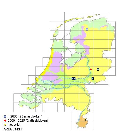 Het aantal atlasblokken (5x5 km) waarin de soort is gemeld binnen een periode van vijf jaar (vanaf 1980) of twintig jaar. Niet gecorrigeerd voor waarnemersinspanning en het aantal doorgegeven waarnemingen kan sterk variëren per periode, dus een trend in verspreiding kan hier niet direct uit worden afgelezen. Het opgegeven jaartal is het eerste jaar van de periode. Bron: gevalideerde waarnemingen uit de NDFF.